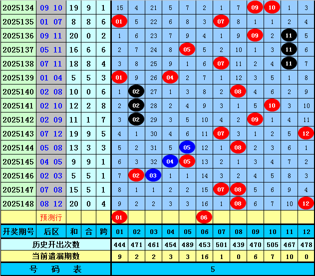 前区奇偶走势:上期开出前区奇偶比1:4,偶数号码走势活跃,最近50期前区奇偶比为125:125,近10期前区奇偶比为22:28,偶数号码表现较热,本期预计偶数号码继续热出,看好奇偶比2:3。