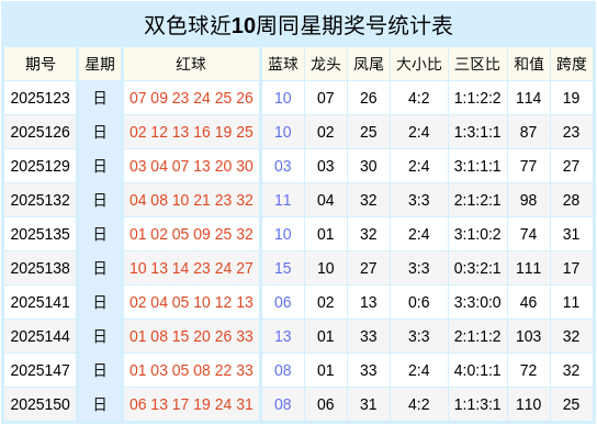 双色球近十周同星期二奖号统计表
